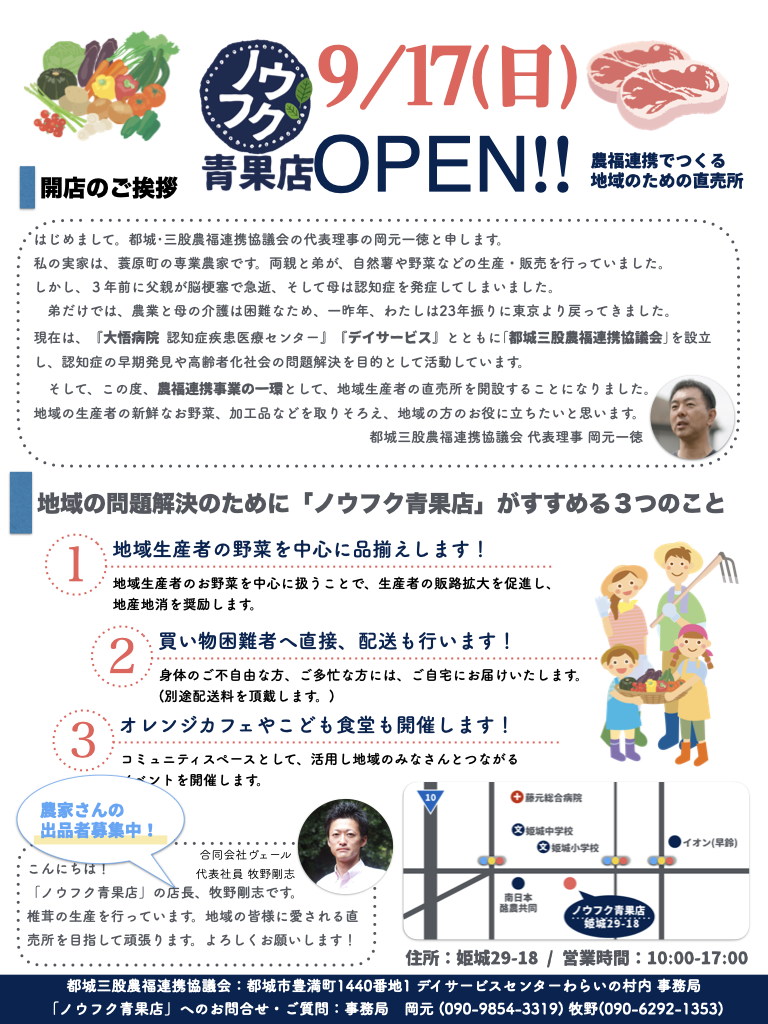 この「ノウフク青果店」は、小売店だけの機能にとどまらず、日々の買い物が困難な高齢者への支援やオレンジカフェなどの機能も付加するなど、地域のコミュニティスペースとしての役割を担う空間としての運営を目指します。