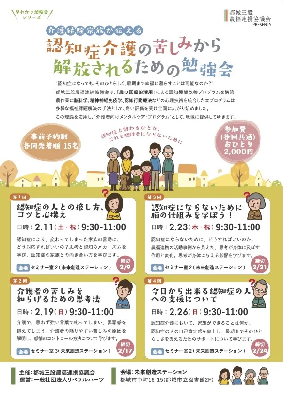 参加者 | ・認知症介護に関わるその家族の皆様 ・認知症介護に携わる医療機関、福祉事業所の皆様 |
